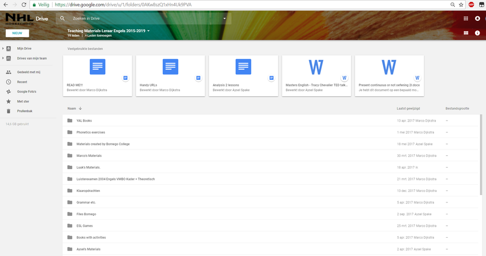 De afbeelding hieronder is een screenshot van een overzicht van een van mijn teamdrives (van Google Drive). Deze teamdrive is een drive die beheert wordt door mijzelf en een aantal medestudenten. Het nut hiervan is dat wij met elkaar gemakkelijk originele opdrachten en andere materialen kunnen delen. Dit scheelt ons allen tijd, we hoeven dan niet allemaal hetzelfde wiel opnieuw uit te vinden.